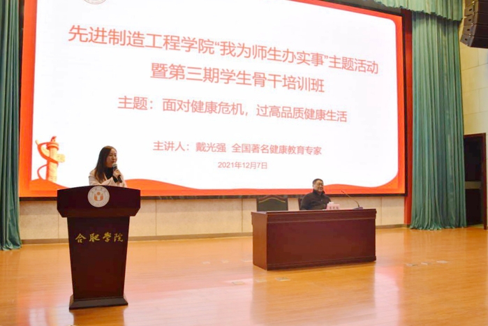为结合党史学习教育,深化“我为师生办实事”主题活动开展,帮助师生养成良好健康的生活习惯,树立正确生活理念,12月7日下午,我校先进制造工程学院在图书馆报告厅举办“我为师生办实事”主题活动,邀请全国著名健康教育专家戴光强教授来我校作健康知识专题讲座,本次讲座以“面对健康危机,过高品质健康生活”为主题,先进制造工程学院全体教职工和学院学生骨干培训班全体学员聆听讲座。讲座由先进制造工程学院党委书记杜娟主持。