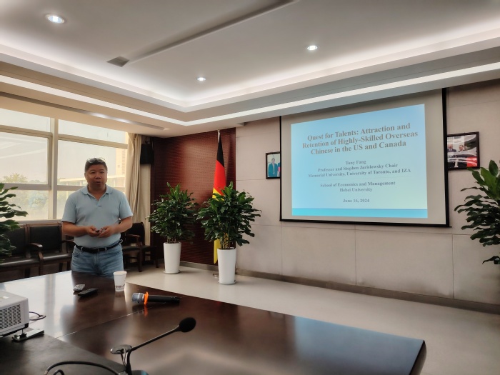 方涛教授以“Attraction and retention of highly skilled overseas Chinese in the United States and Canada”(《美国和加拿大对海外华人高端人才的吸引与留用研究》为题给经济与管理学院师生做了一场精彩的学术报告。他结合丰富的研究数据与案例,深入剖析美加两国吸引和留住海外华人高技能人才的策略。报告结束后,方涛与经济与管理学院师生、德籍教授汤卫思进行座谈,就国际人才流动趋势、区域经济发展与人才政策等议题展开讨论,碰撞出诸多思想火花。